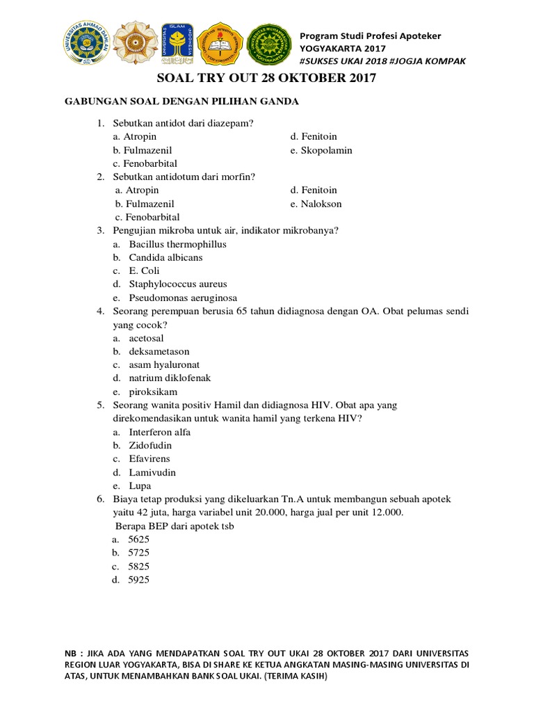 Soal Ukai Osce Pdf from imgv2-1-f.scribdassets.com Soal cpns ini merupakan kumpulan dari soal cpns 2018 pdf, soal cpns 2019 pdf, dan soal cpns 2020 pdf. Contoh soal tkd cpns soal tkd soal tpa tes intelegensi umum tiu. 15 968 просмотров 15 тыс. Ukai merupakan kepanjangan dari ujian kompetensi apoteker indonesia dimana para calon apoteker harus melakukan ukai ini setelah semua kegiatan perkuliahan, pkpa dan sidang kompre selesai. Teknologi sediaan farmasi soal ukai. Beli ukai online harga murah terbaru 2021 di tokopedia! Soal try out ukai angkatan 104.pdf. Iketahui pasien men!erita hiperkalemia $lupa g pastina apa% se&ak 5 tahun lalu !an !i !iangnosa mengalami angina.terapi apa ang !i#erikan 'a.